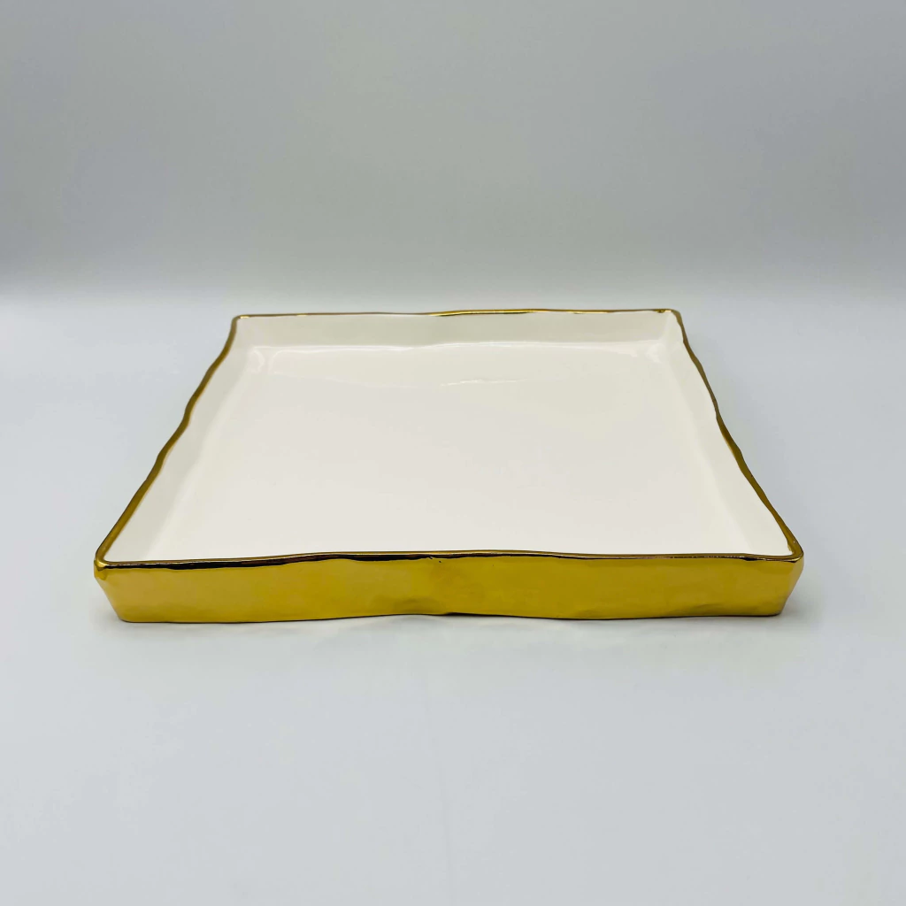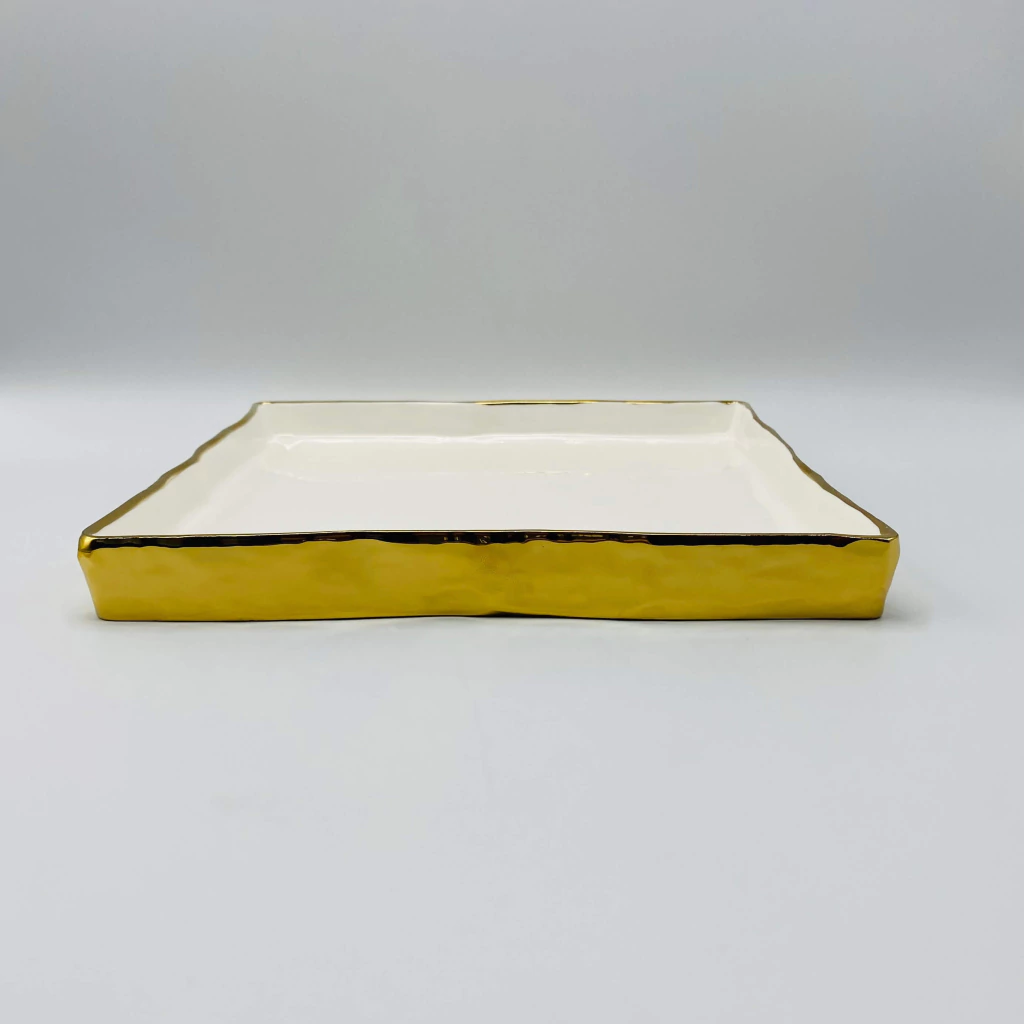 Bandeja Decorativa de Porcelana Branca Quadrada com Borda Dourada