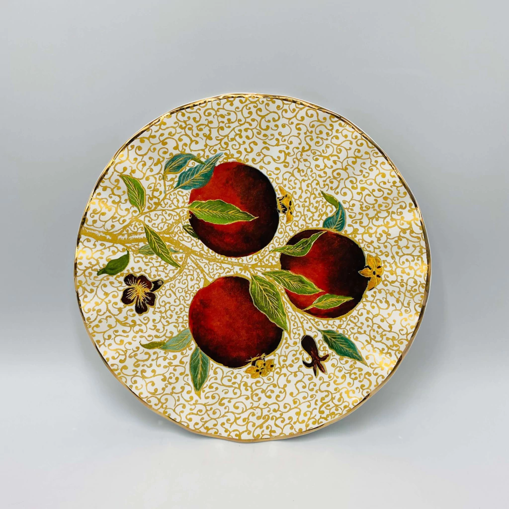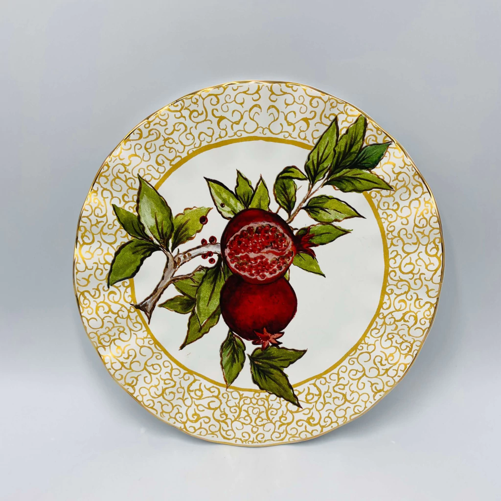 Nesta versão, um galho com romã inteira e folhas bem detalhadas ocupa o centro do prato, com o mesmo padrão elegante de arabescos dourados ao redor da borda. A ilustração realista dá a sensação de um quadro botânico, tornando o prato uma verdadeira peça decorativa à mesa. Fabricado em cerâmica resistente, garante durabilidade e acabamento sofisticado.