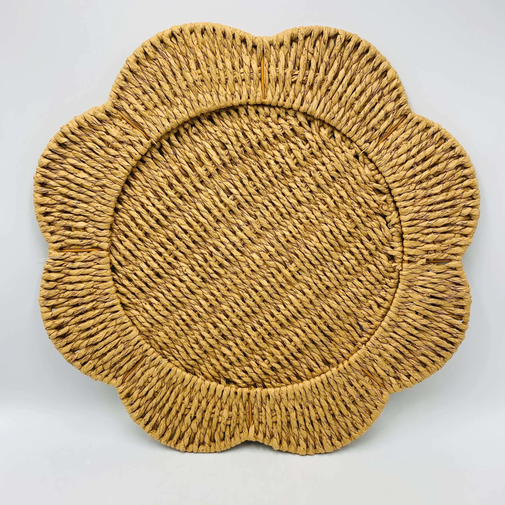 Este sousplat em formato de flor é confeccionado em fibra de papel natural, trazendo um toque rústico e sofisticado à decoração da mesa.
